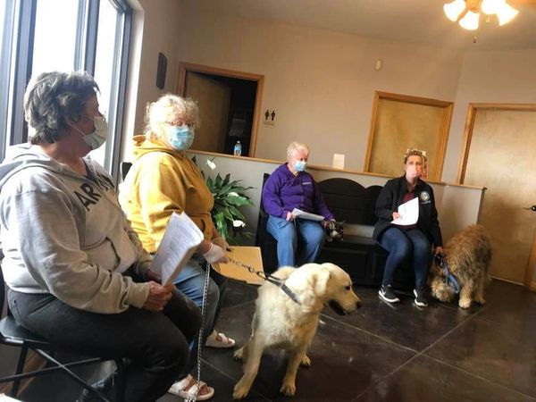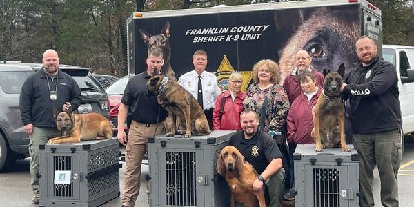 Missouri Rhineland Kennel Club donated four Impact dog crates, valued at around $1200 each, to the Franklin County Sheriff's Department on December 14, 2022. The club, which has been in Franklin County for more than 30 years, has previously donated to the Washington Police Department, Franklin County Humane Society, Home At Last Organization In Sullivan and the Buddy Fund at the Franklin County Animal Medical Center. The club has meetings at 6:30 p.m. on Mondays most months at the Washington Elks Lodge and has shows and educational programs. Pictured, front row, from left: Det. Donnie Dunn with K-9 Dino; Dep. John Stack with K-9 Kilo; Det. Jeff Friedmann with K-9 Copper; and Dep. Tony Davis with K-9 Rollo. Back row: Sheriff Steve Pelton; MRKC donation Chair Cindy Brown; Pres. Joy Atkins-Miller, and board members Carl and Sharon Rosenkoetter. Missouri Photo/Geoff Folsom